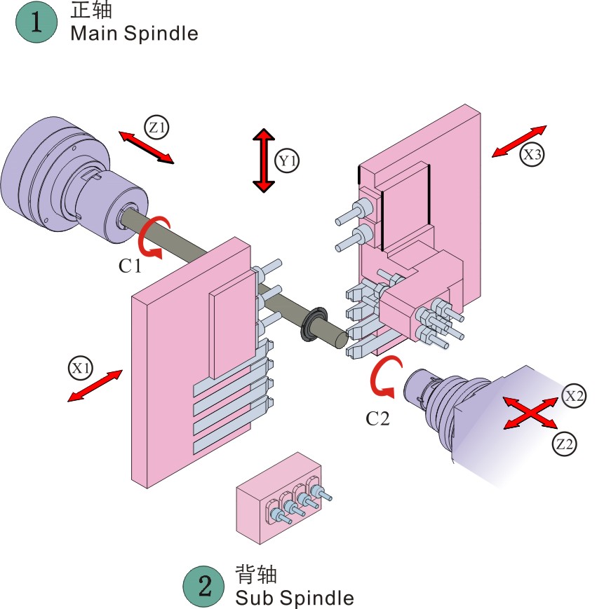 8、三通道控制方式,主軸端雙X軸控制兩把刀具同時與工件接觸,可實現(xiàn)兩側同時銑面、車削、打孔工藝,大大節(jié)省了加工效率。